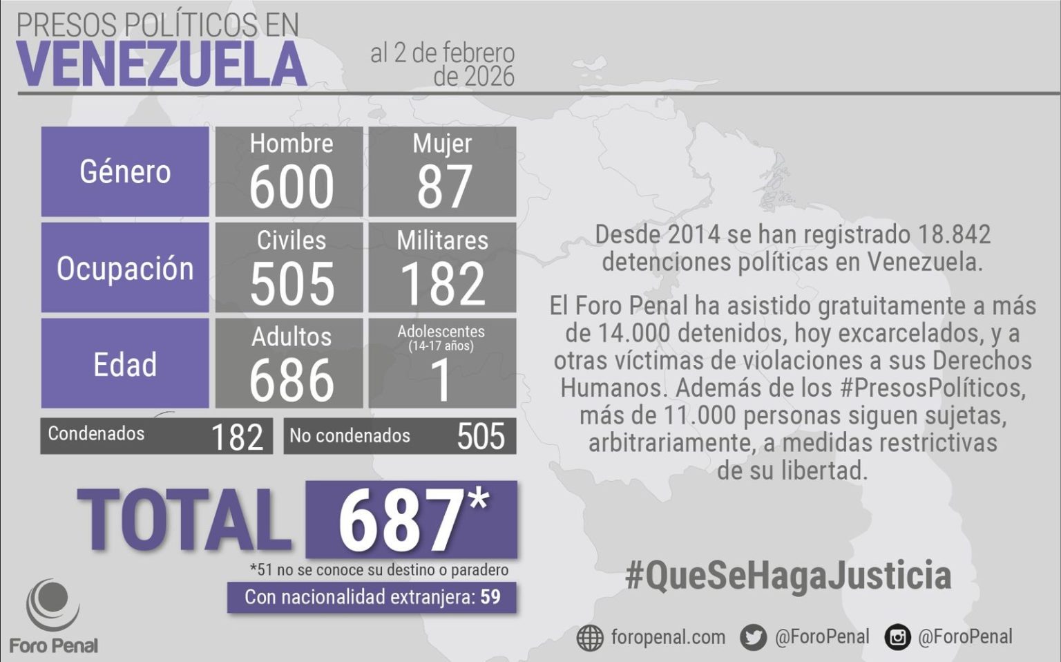 A organização não governamental Foro Penal divulgou novos dados sobre presos políticos na Venezuela, revelando que o país mantém 687 pessoas detidas por motivações políticas. Segundo o relatório da ONG, 51 desses detentos têm paradeiro desconhecido, uma situação que agrava ainda mais as preocupações sobre direitos humanos no país sul-americano.